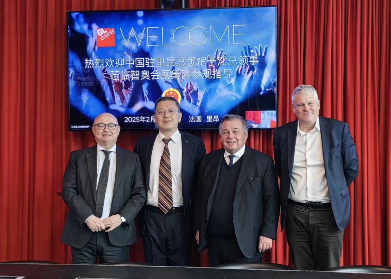 le 26 février 2025, m. yu jiang, consul général de chine à lyon, a été invité à visiter le groupe gl events. lors de cette visite, il a eu des échanges approfondis et amicaux avec m. olivier ginon, président du groupe, m. christophe cizeron, président pôle veunes, et m. philippe pasquet, président pôle exhibition.