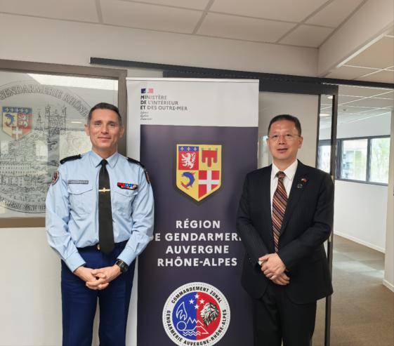 le 2 avril 2025, le consul général de chine à lyon, m. yu jiang, a rendu une visite de courtoisie au général de corps d’armée christophemarietti, commandant de la gendarmerie de la région auvergne-rhône-alpes. le vice-consul général, m. li zhenping, l’accompagnait.