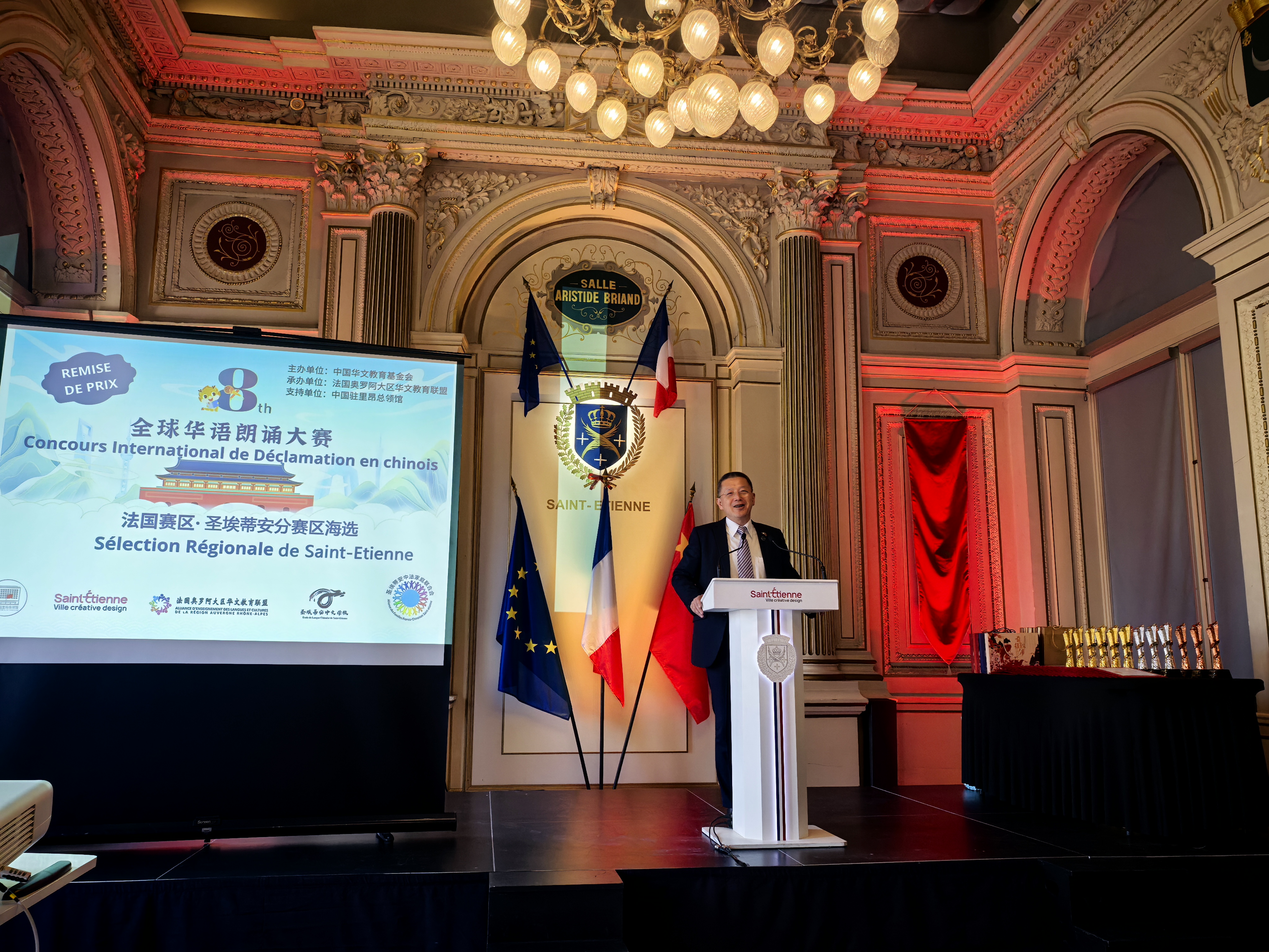 2025年4月22日,驻里昂总领事于江赴领区圣埃蒂安市,出席第八届全球华语朗诵大赛法国圣埃蒂安分赛区颁奖仪式。圣埃蒂安副市长沙索贝内、圣埃蒂安中文学校校长王晓茜、法国小熊猫学校校长罗坚、里昂中国文化之家会长施东伟及当地华校学生、家长、友好人士约80人出席。