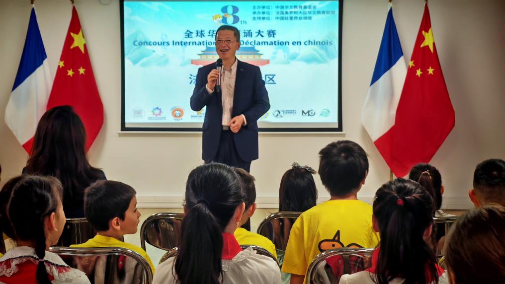 2025年6月4日,第八届全球华语朗诵大赛法国奥罗阿大区颁奖仪式在驻里昂总领馆举行。于江总领事、李振平副总领事、法国奥罗阿大区华文教育联盟主席罗坚及领区华校师生、中法两国家长等约60人出席。